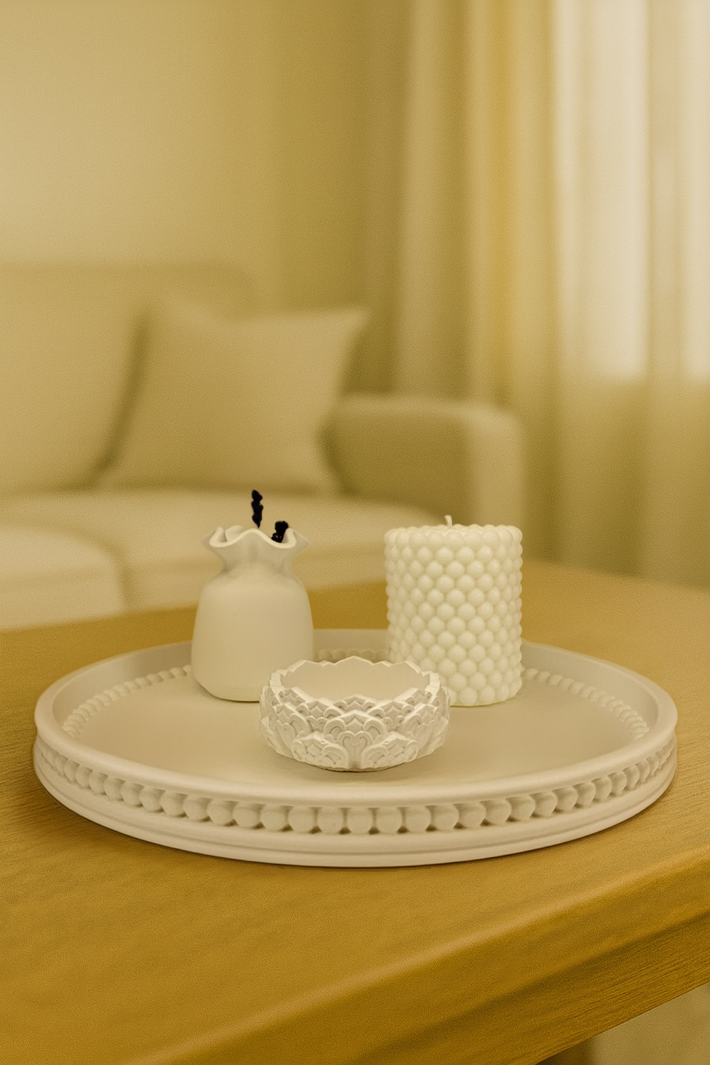 Dekorasyonunuza modern bir soluk getirecek bu 4 parçalık set, bubble mum,  büzgülü vazo, lotus kase ve tepsiden oluşur. Hem minimalist hem de şık görünümü sayesinde masa ve raf dekorasyonlarınızda bütünlük sağlar. Özel günlerde hediye olarak da tercih edilebilir.