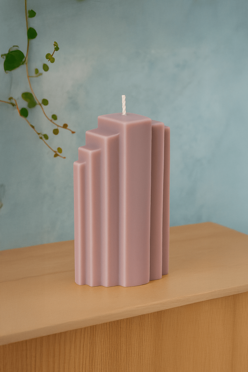 Geometrik hatlarıyla modern ve sanatsal bir görünüm sunan bu sütun mum, dekorunuza farklı bir hava katar.